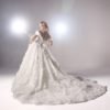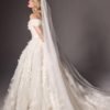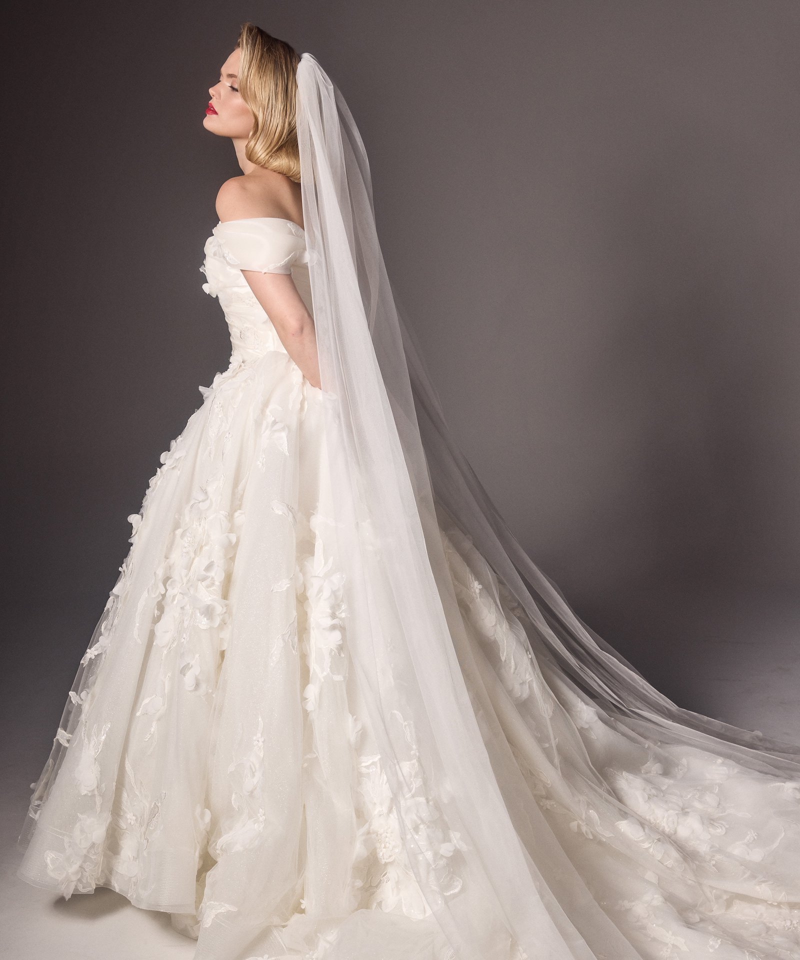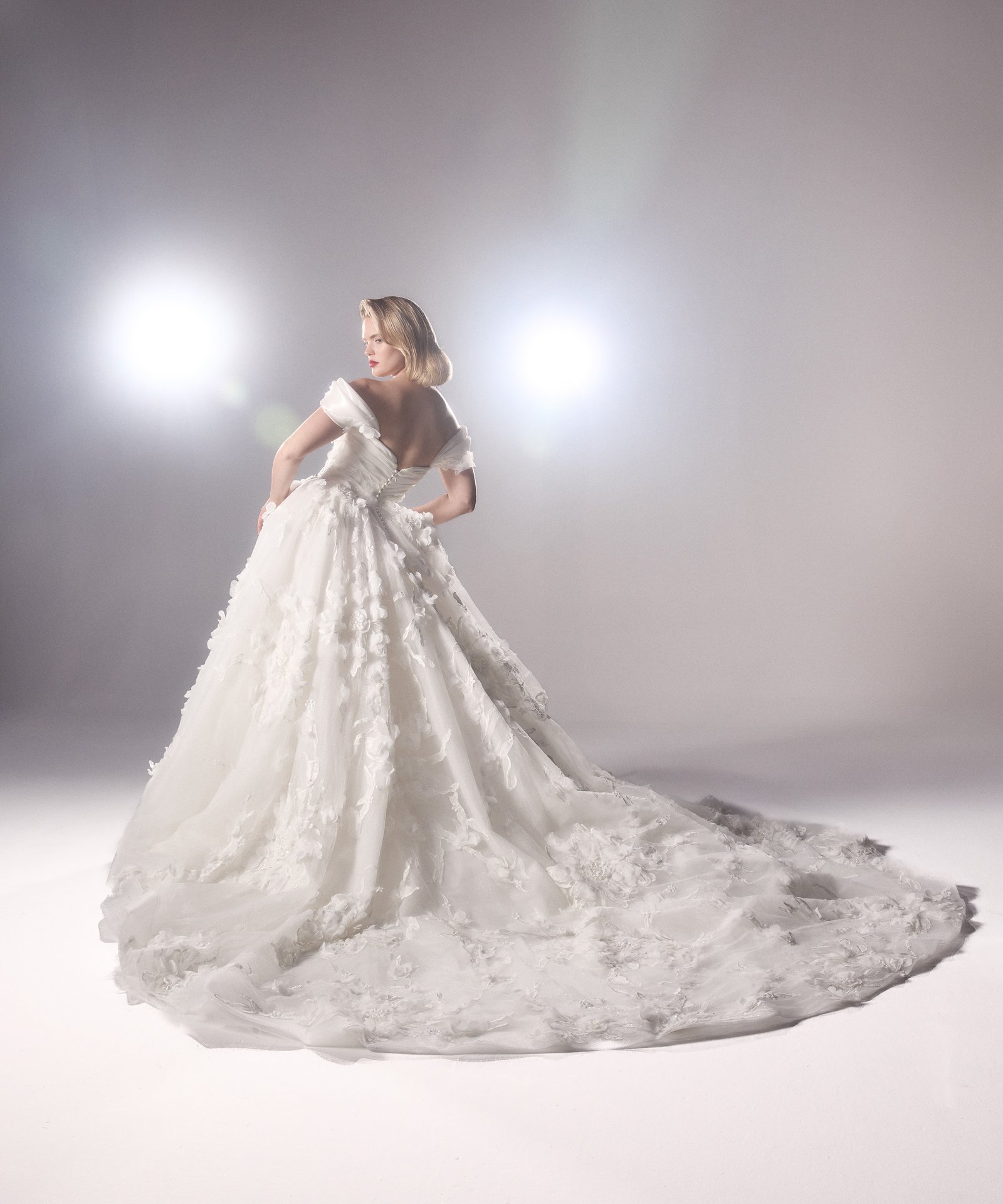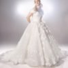 Italian liquid silk organza draped adjusted neckline bodice matching with hand beaded 3d lace dramatic ball gown skirt. Detachable draped swag with matching 3d appliques.