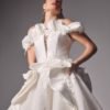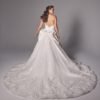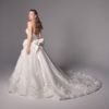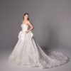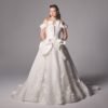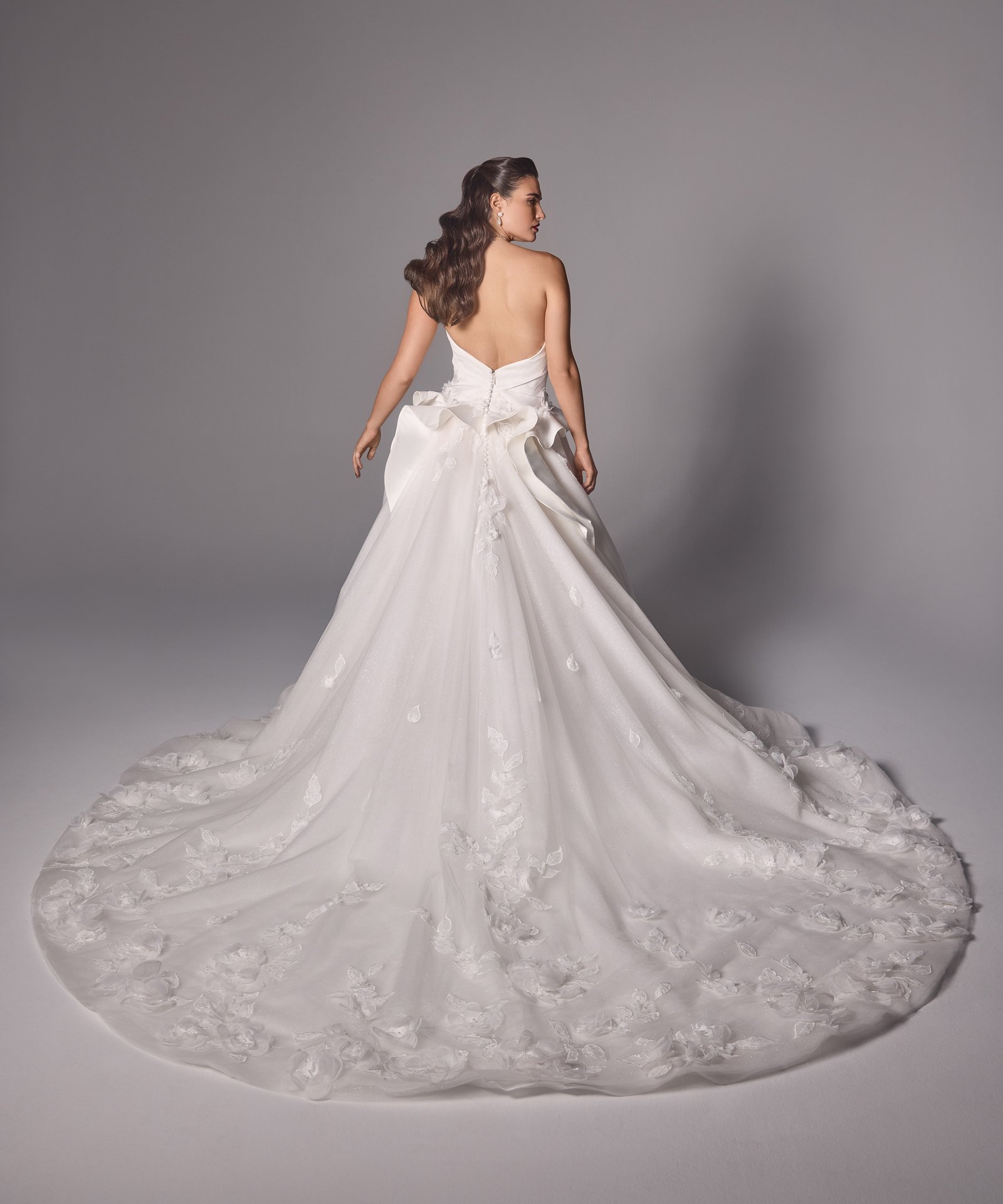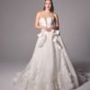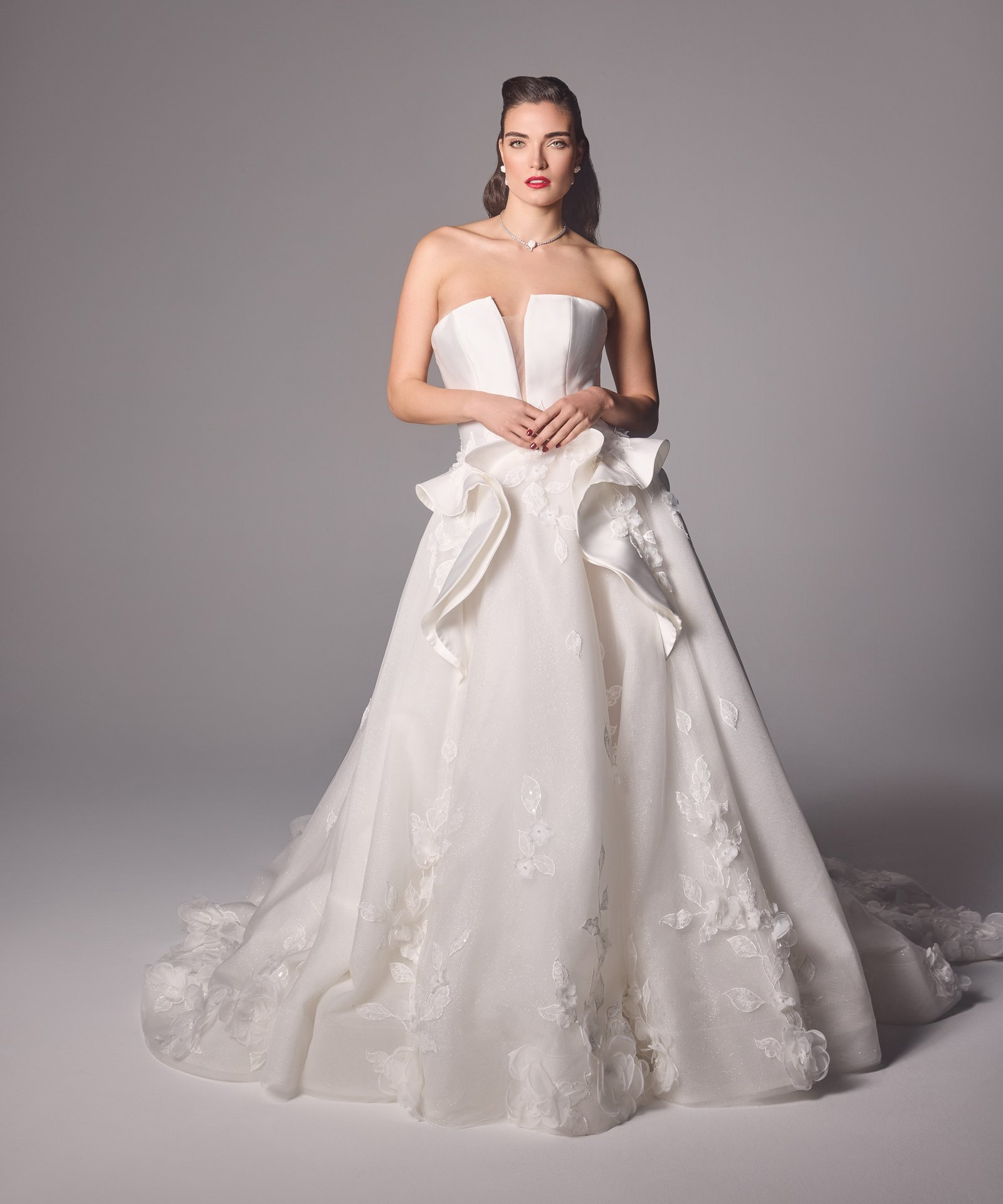 Silk new magnolia deep v plunge bodice matching with ruffles and 3d hand crafted flowers on top of fine finished tulle. Detachable off-shoulder draped detailed dramatic shawl .