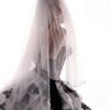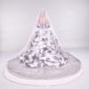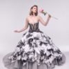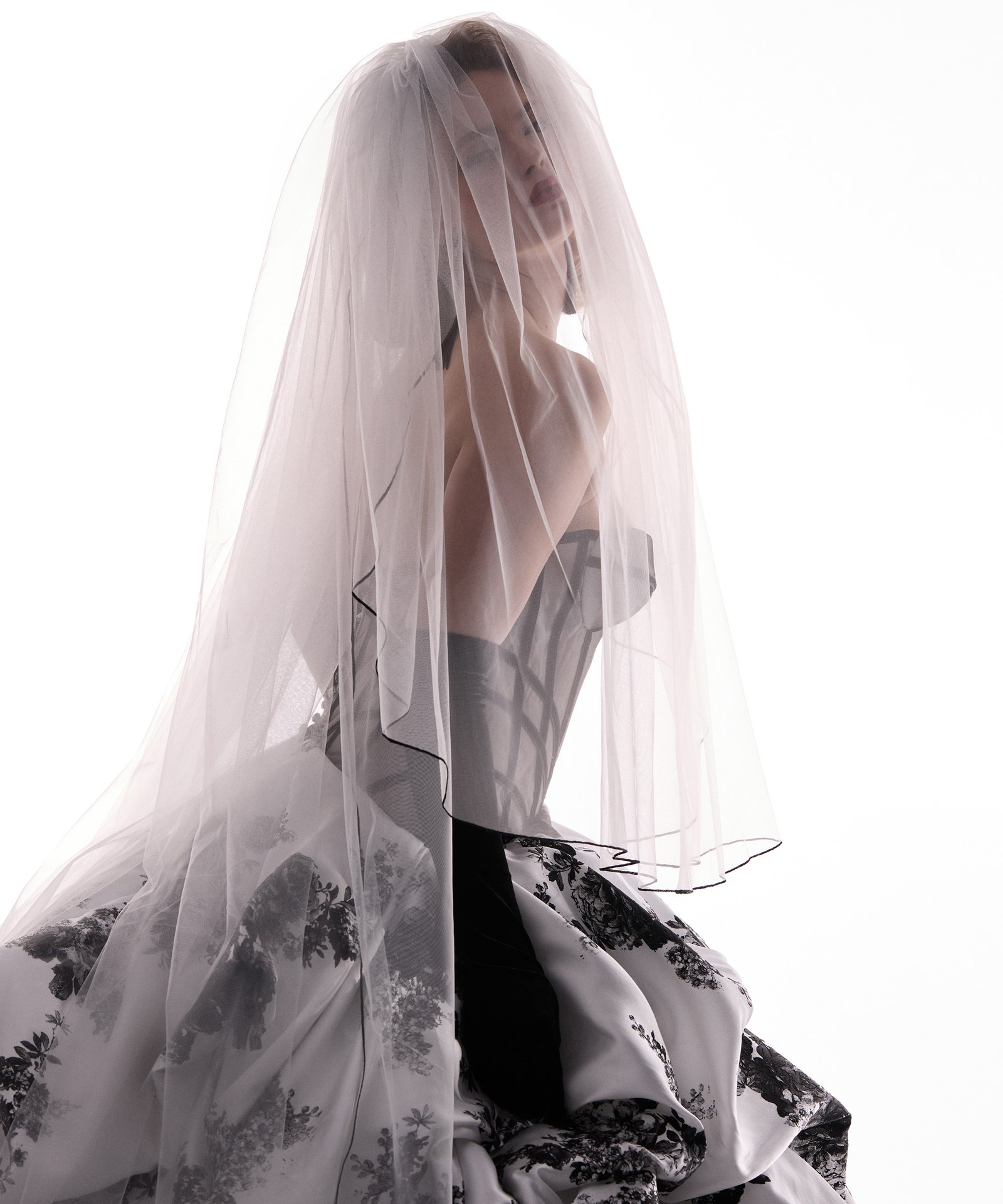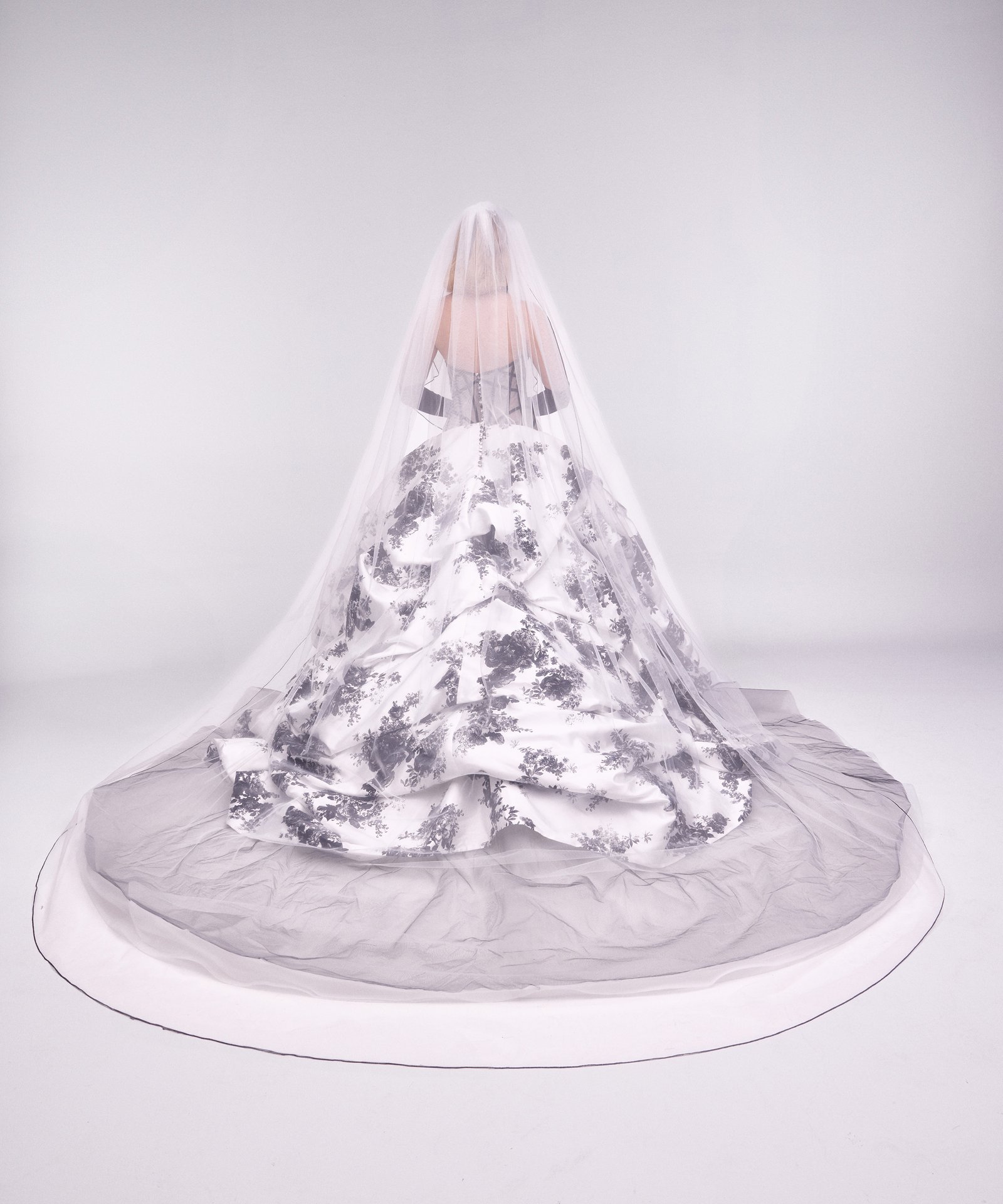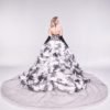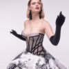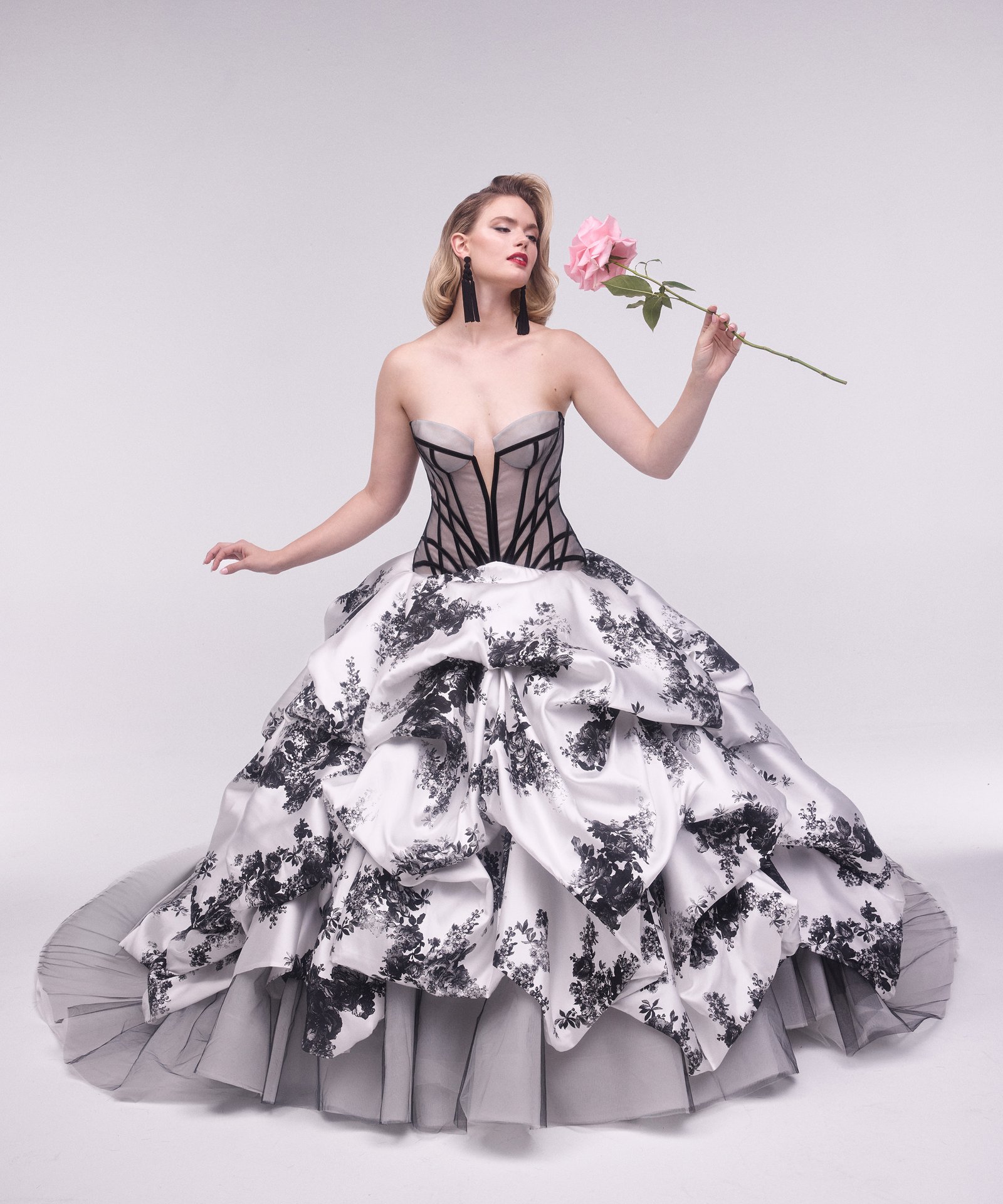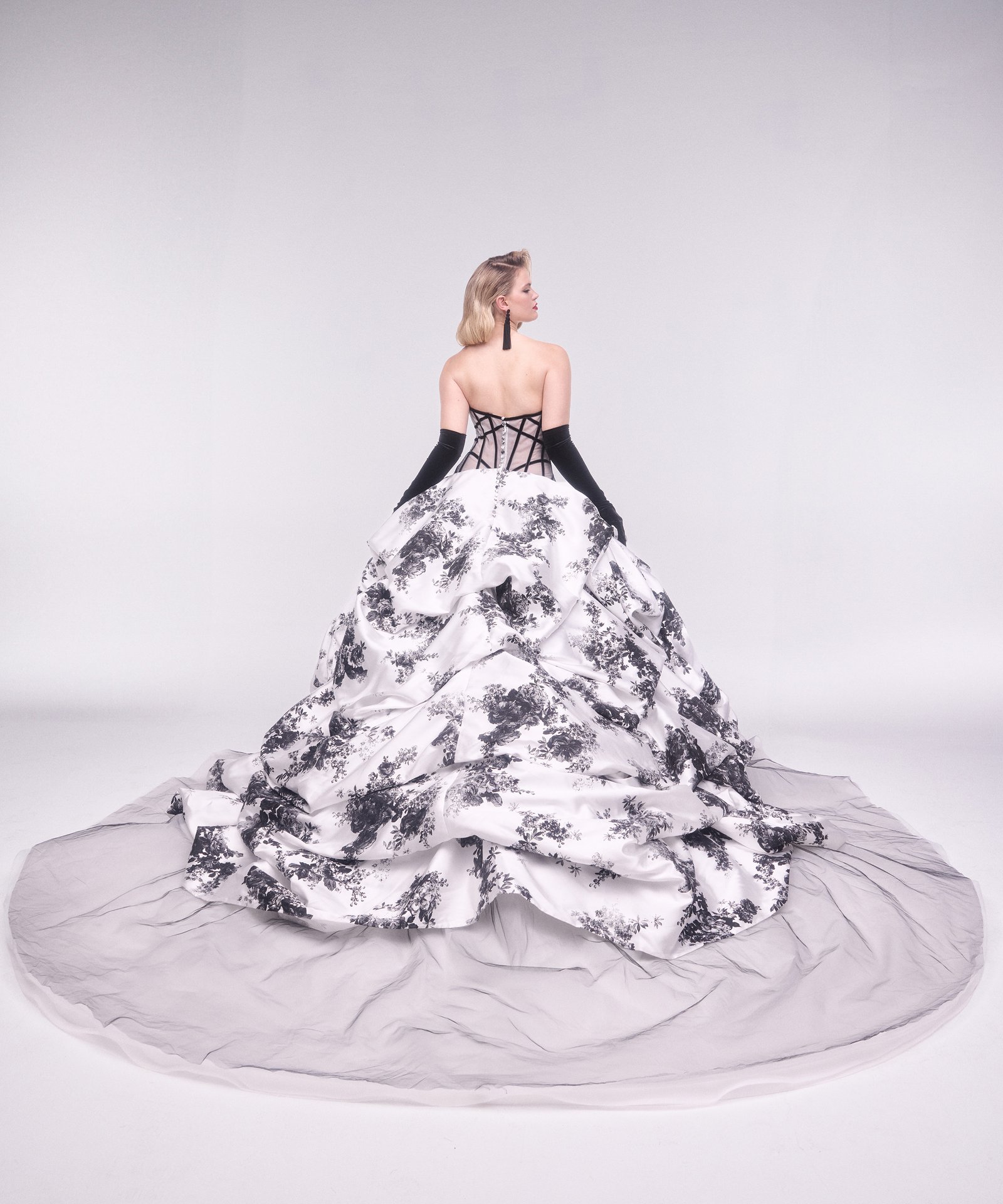 Couture shear constructed corset finished with silk velvet-satin ribbons. Premuim printed italian silk mikado skirt with pick up on top of mixed tulle layers ball gown skirt base joined into the adjusted corset waist line.