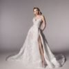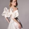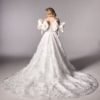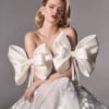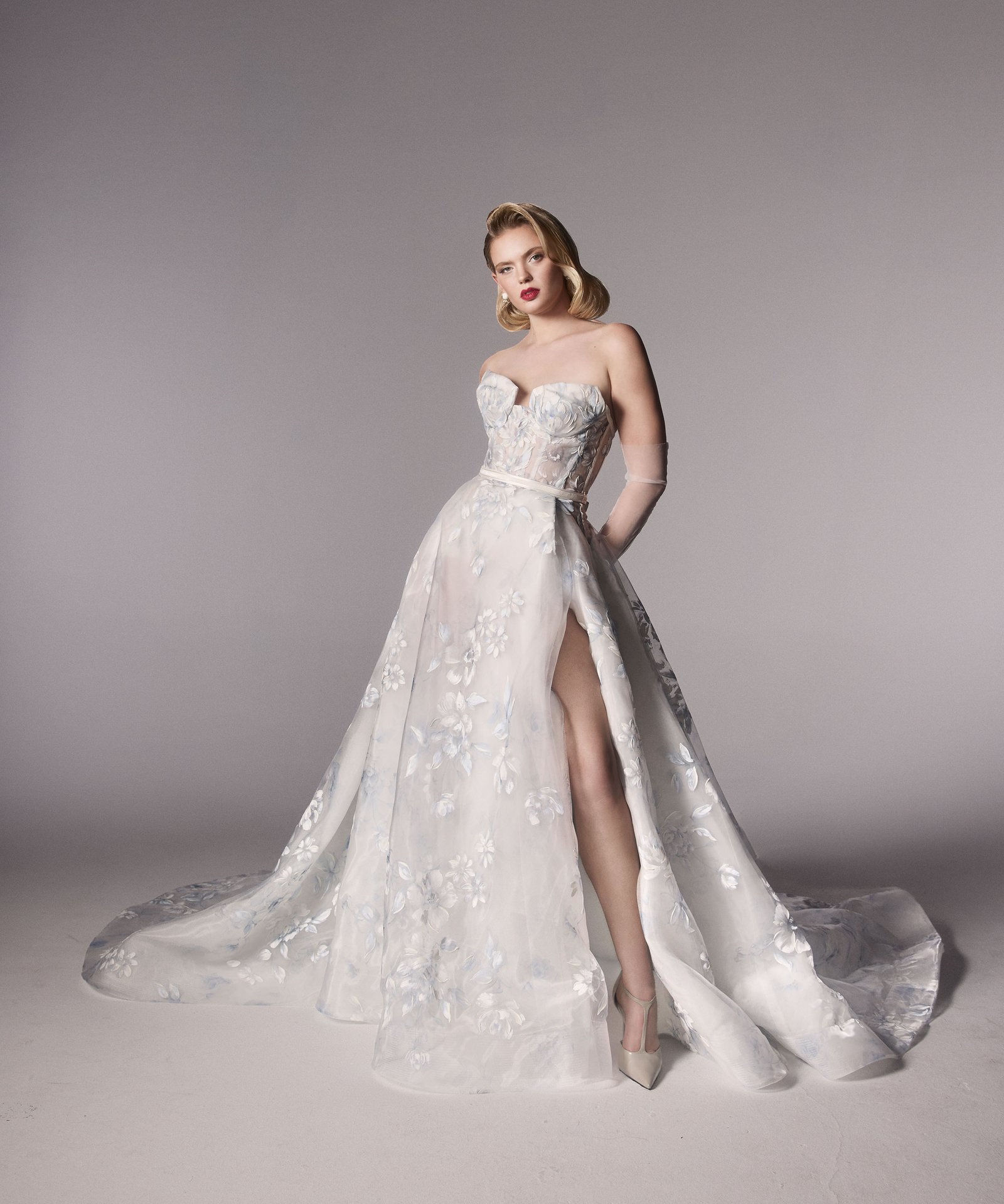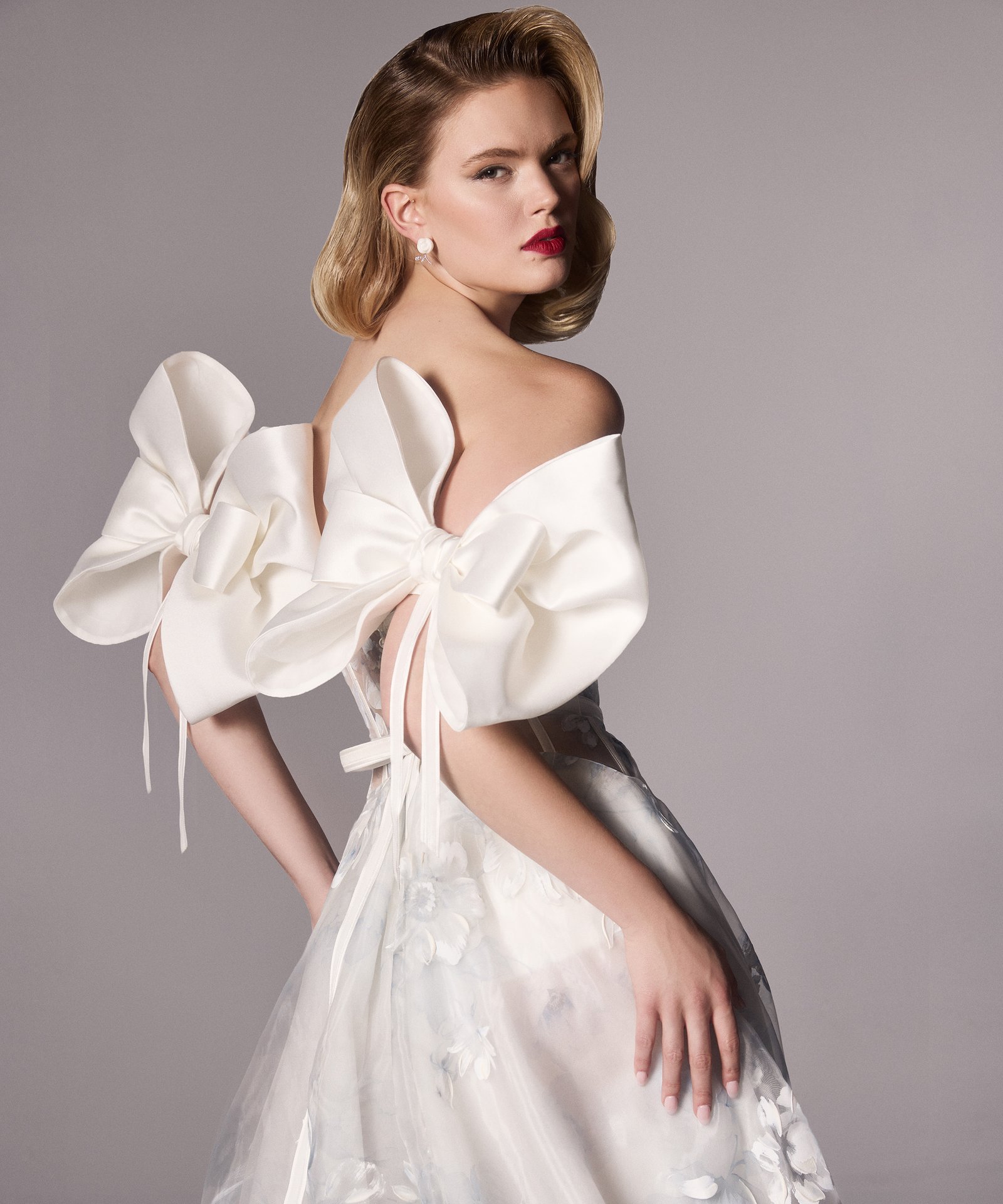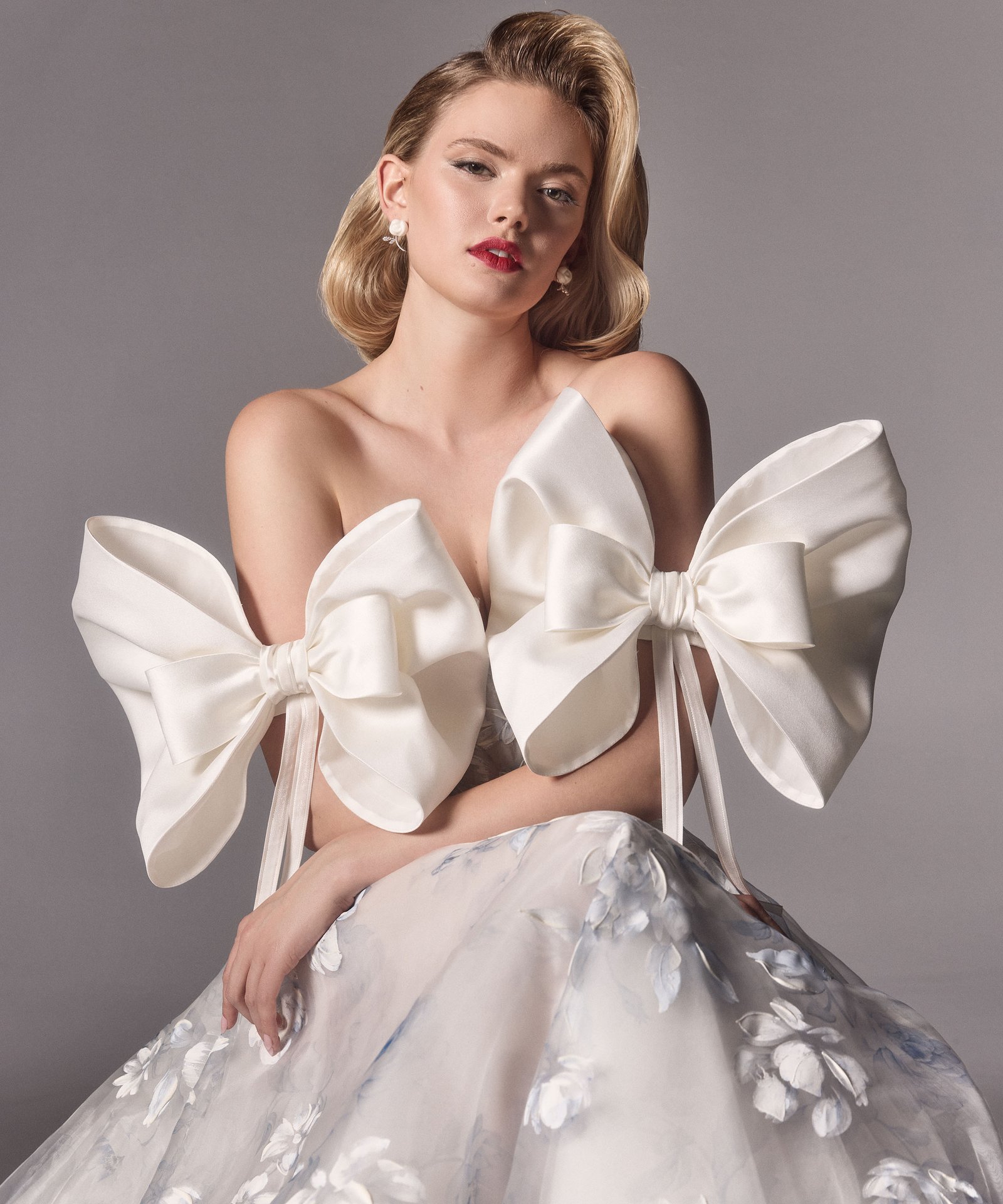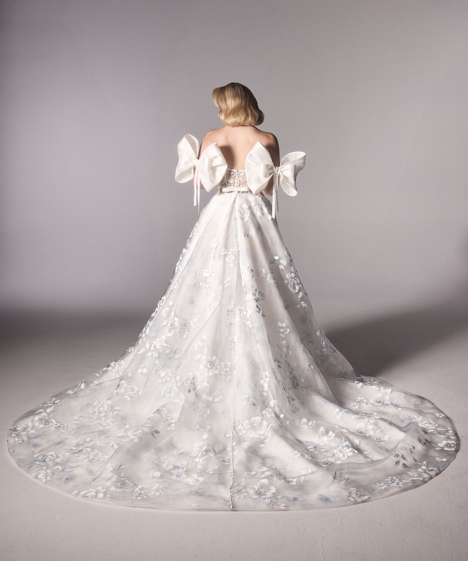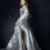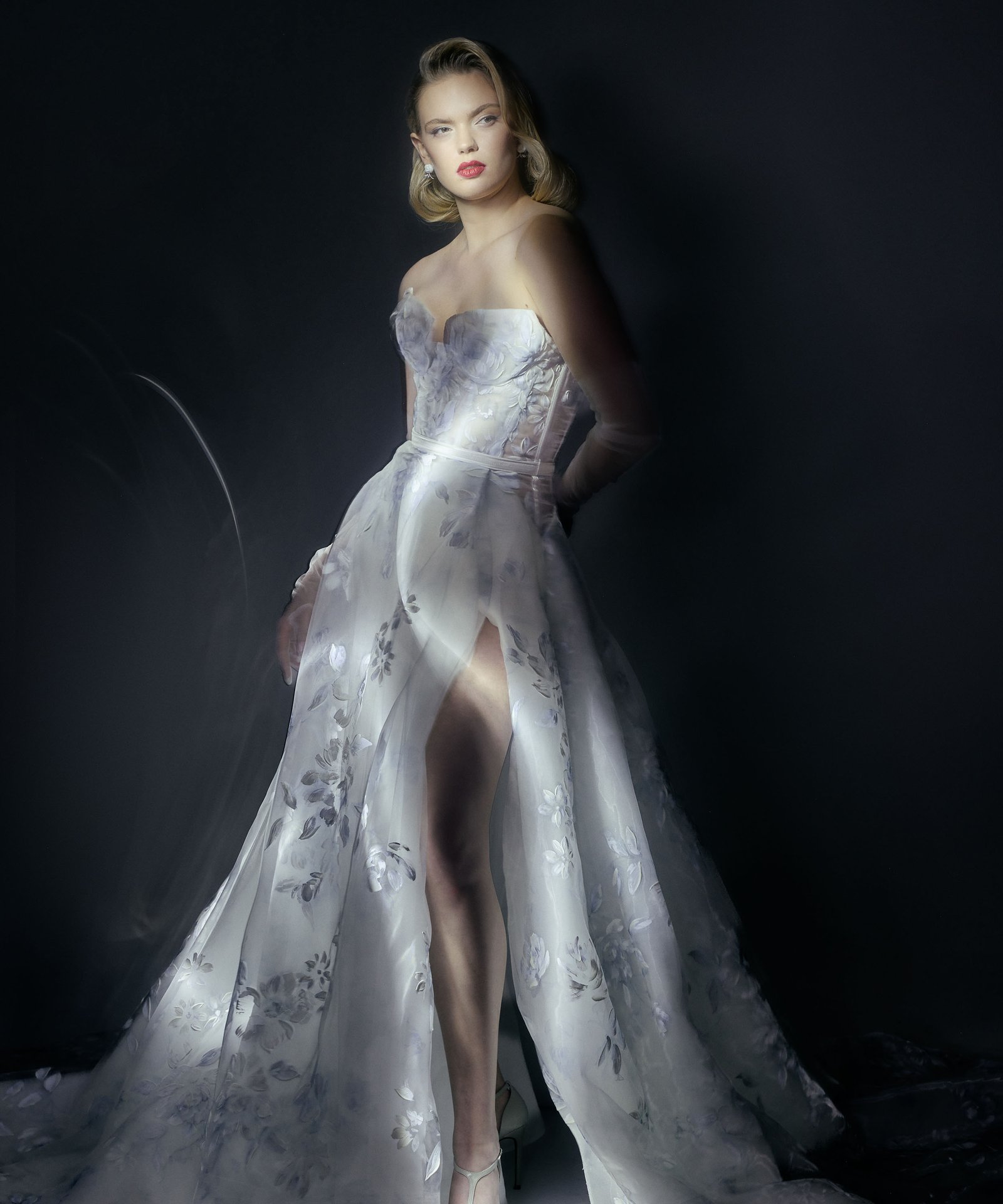 Artist floral hand painted italian craftmanship on top of fine printed crinolina, corset bodice with sculptured neckline and shear back detailed exposed boning finished with silk velvet coating. Full skirt with slit and side pockets. Detachable belt with bow detail. Matching draped sleeves.