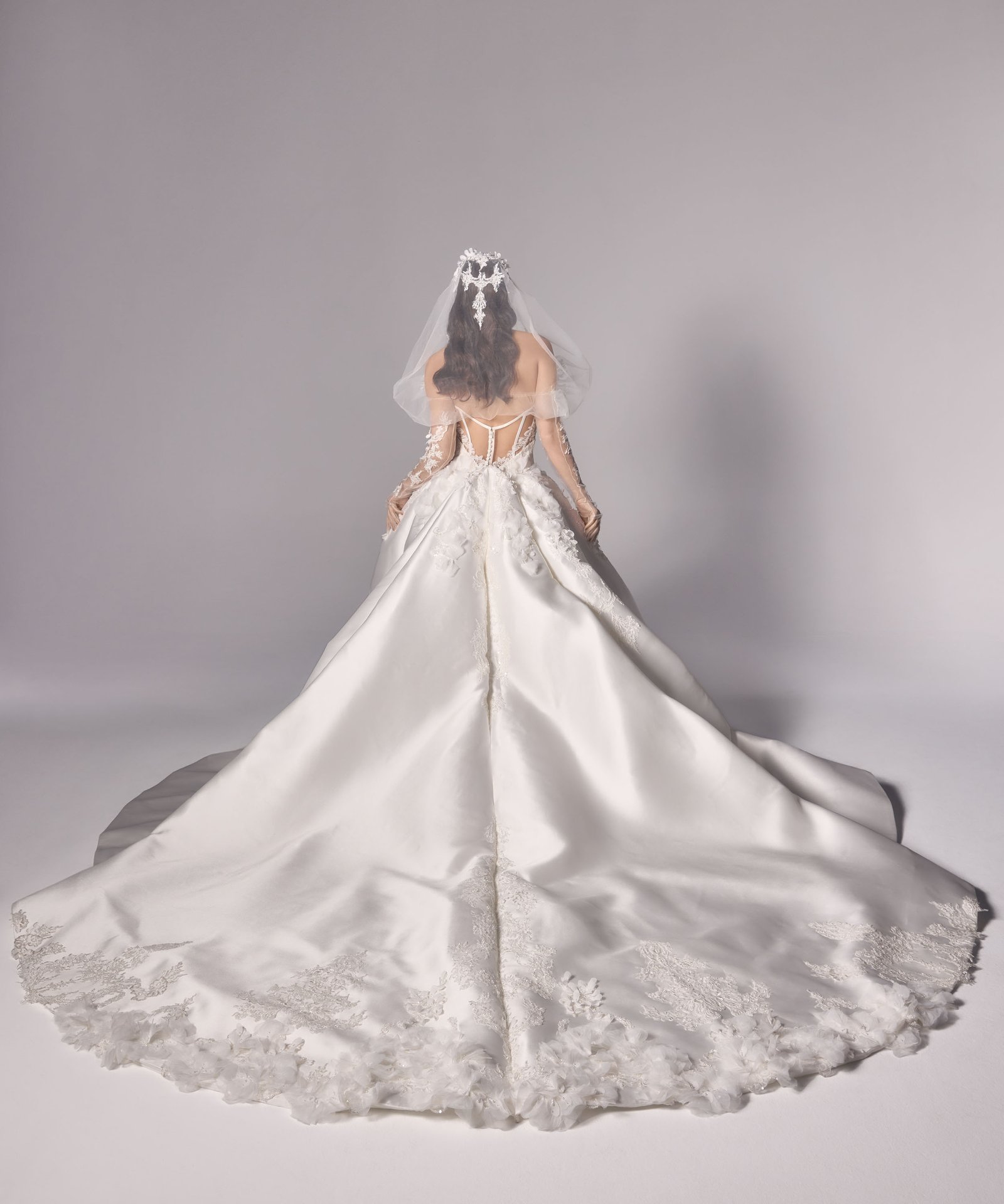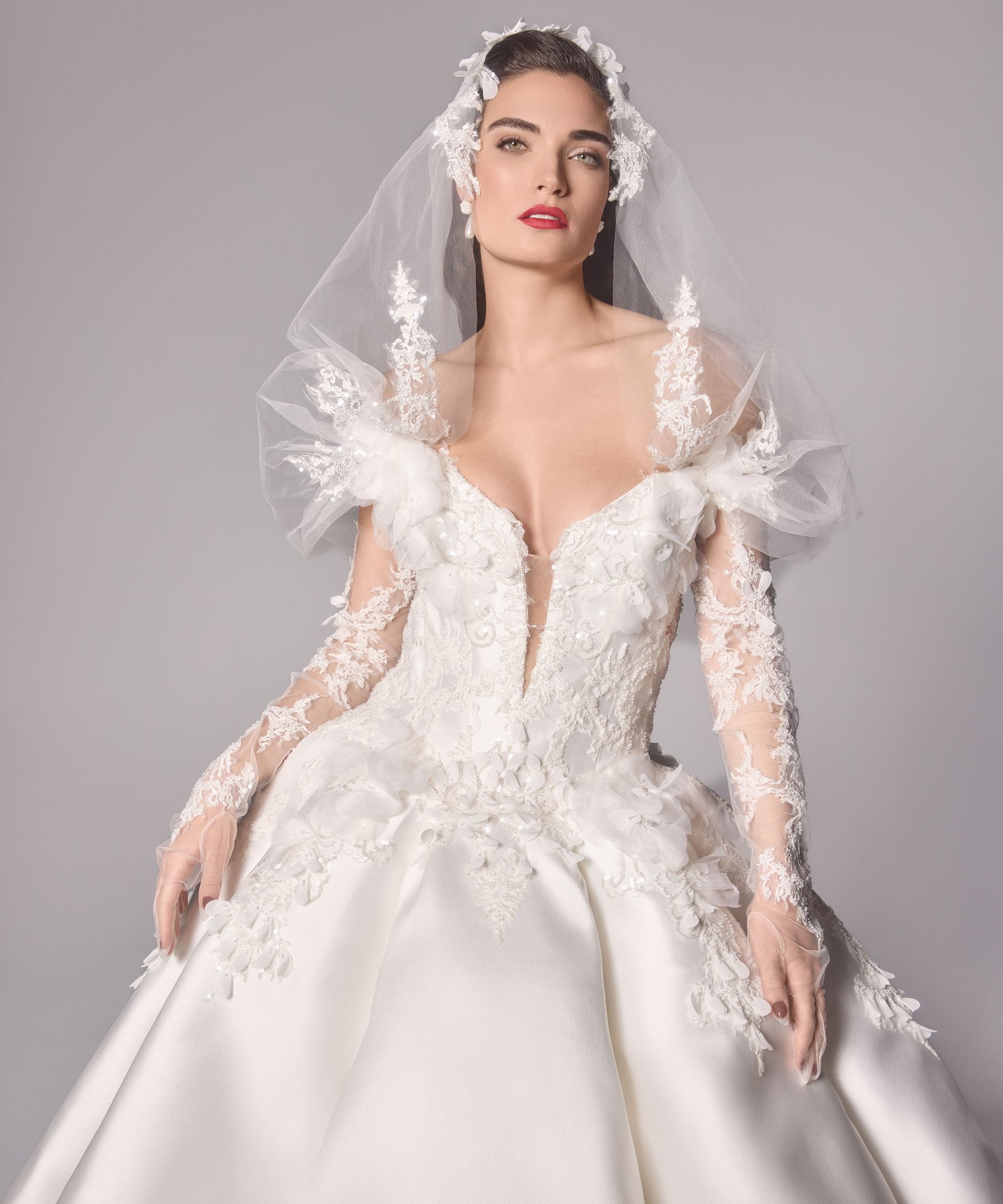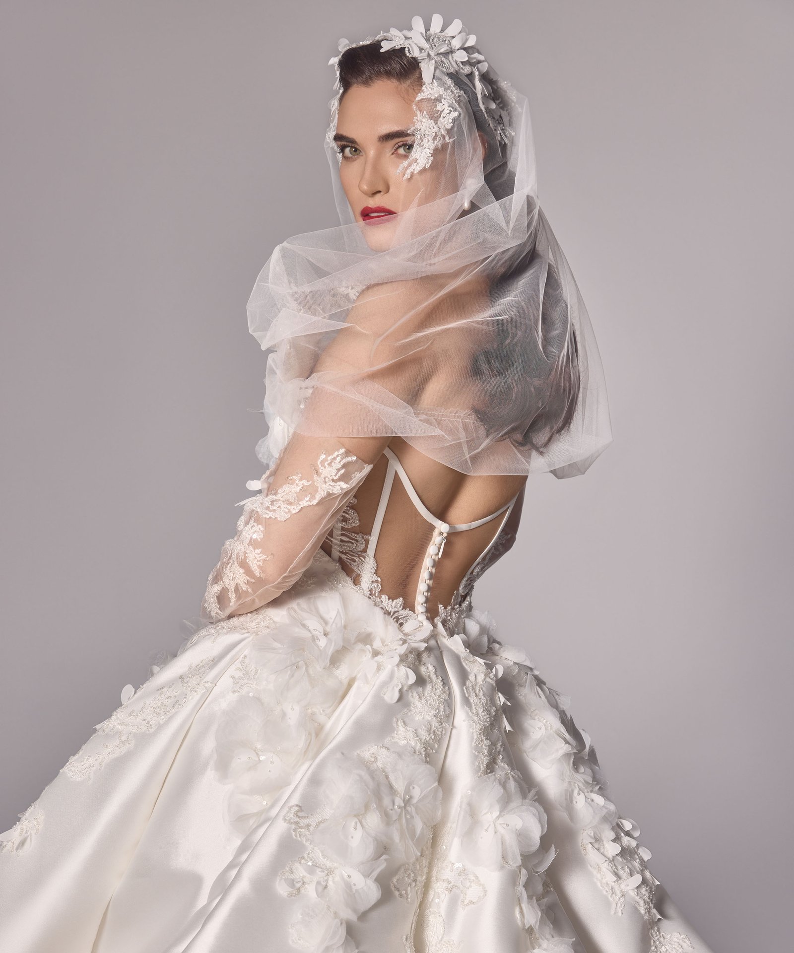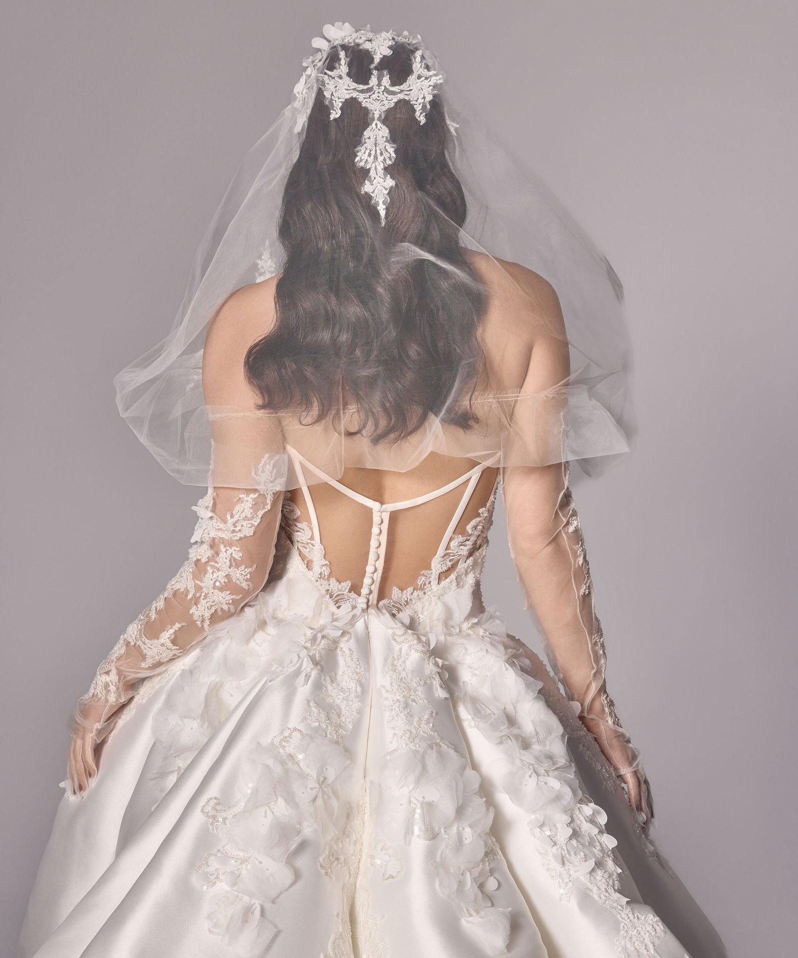Ruched adjusted neckline bodice with 3d hand sewn appliques on top of fine chantilly lace, deep v basque dropped waist joined into adjusted ball gown skirt with placed continous 3d appliques. Matching lace gloves. Detachable draped off shoulder-head shawl with lace applique artwork placement.