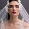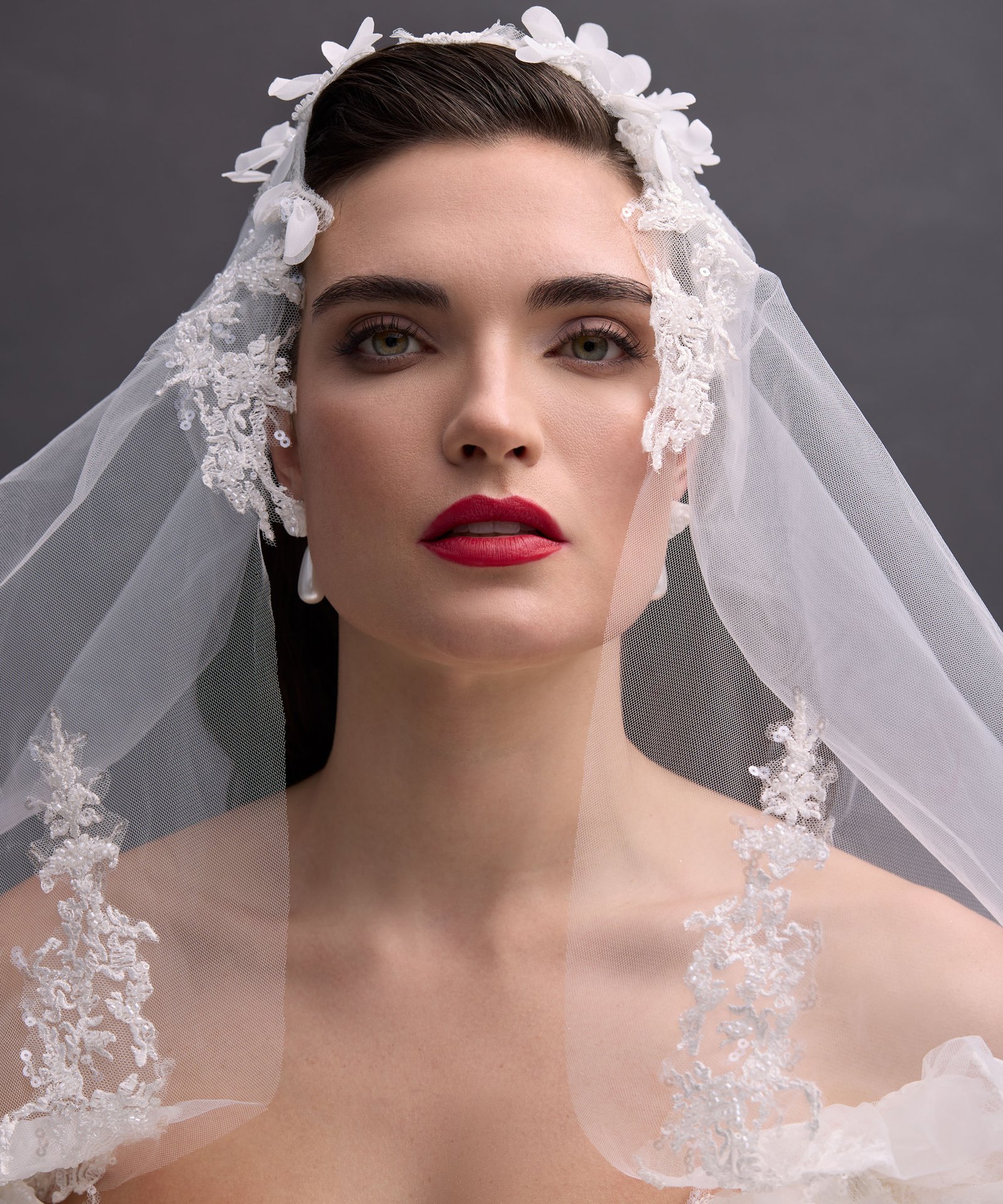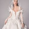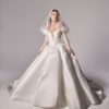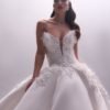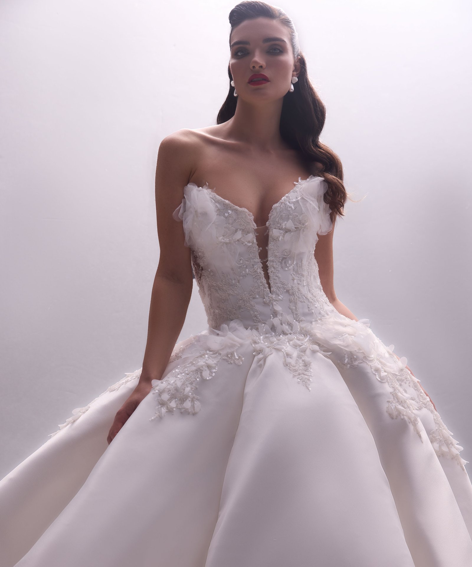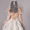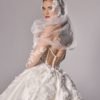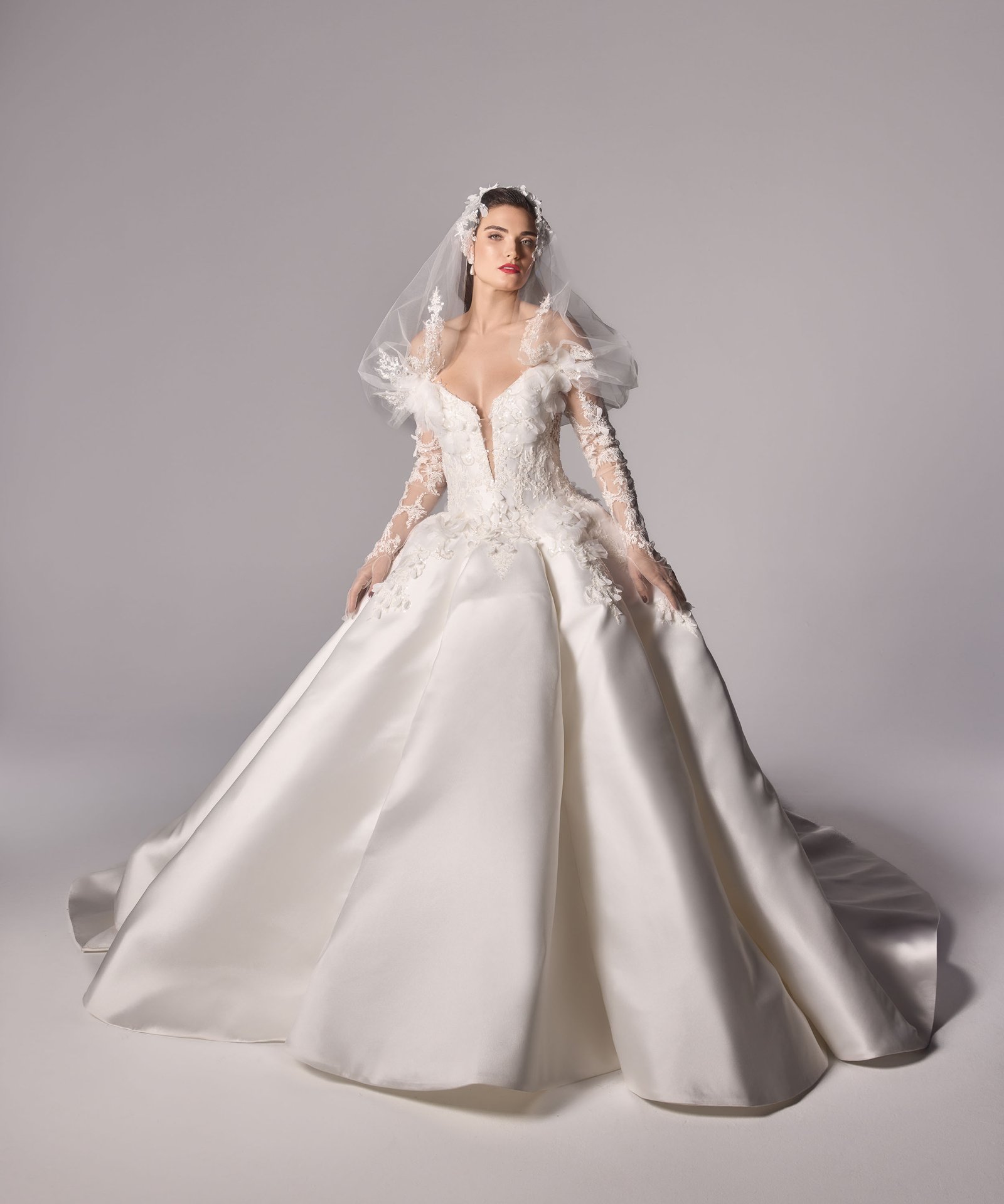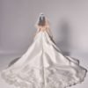 Ruched adjusted neckline bodice with 3d hand sewn appliques on top of fine chantilly lace, deep v basque dropped waist joined into adjusted ball gown skirt with placed continous 3d appliques. Matching lace gloves. Detachable draped off shoulder-head shawl with lace applique artwork placement.