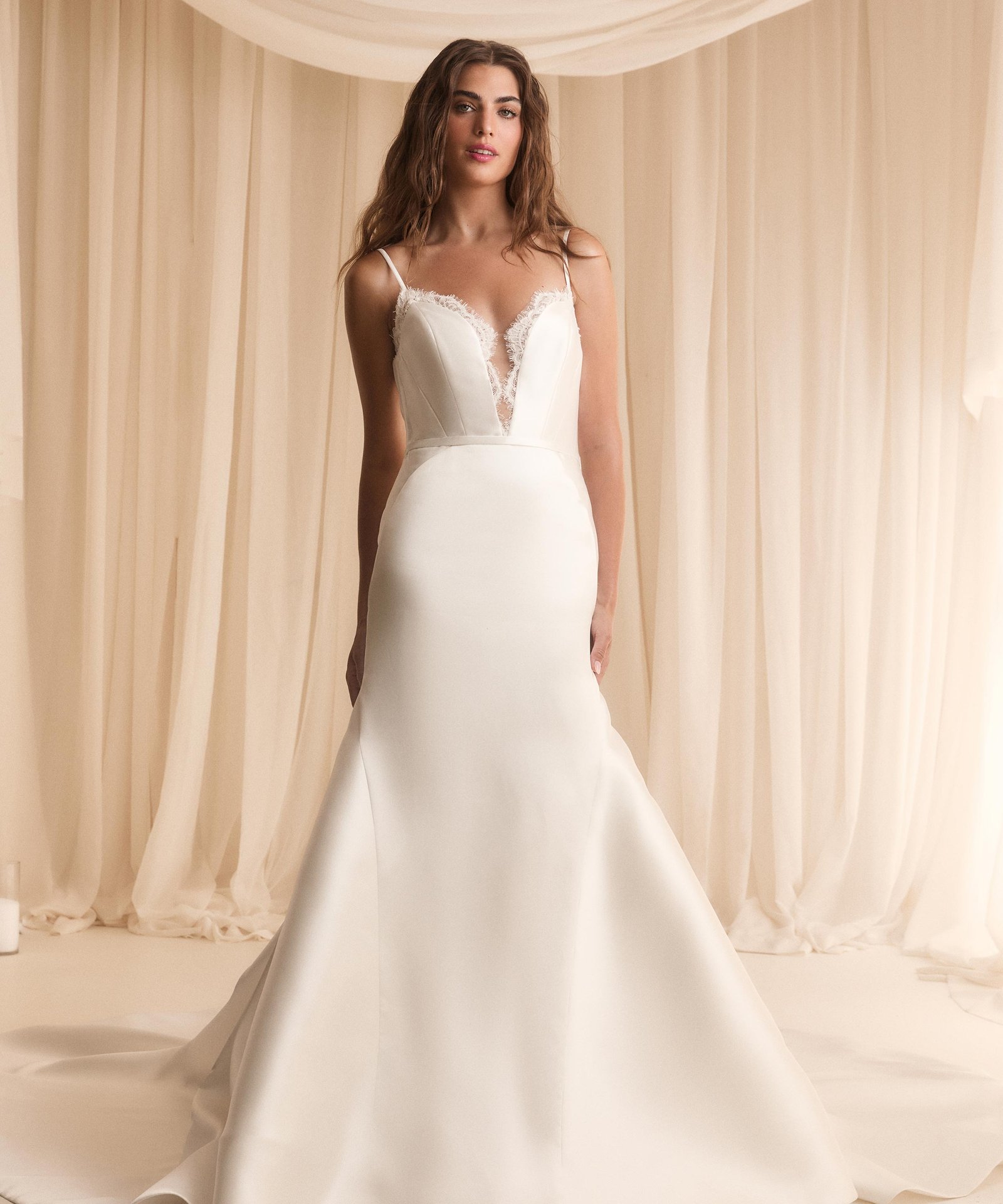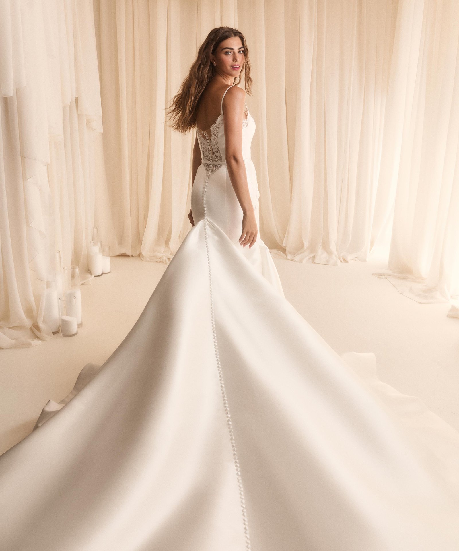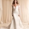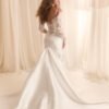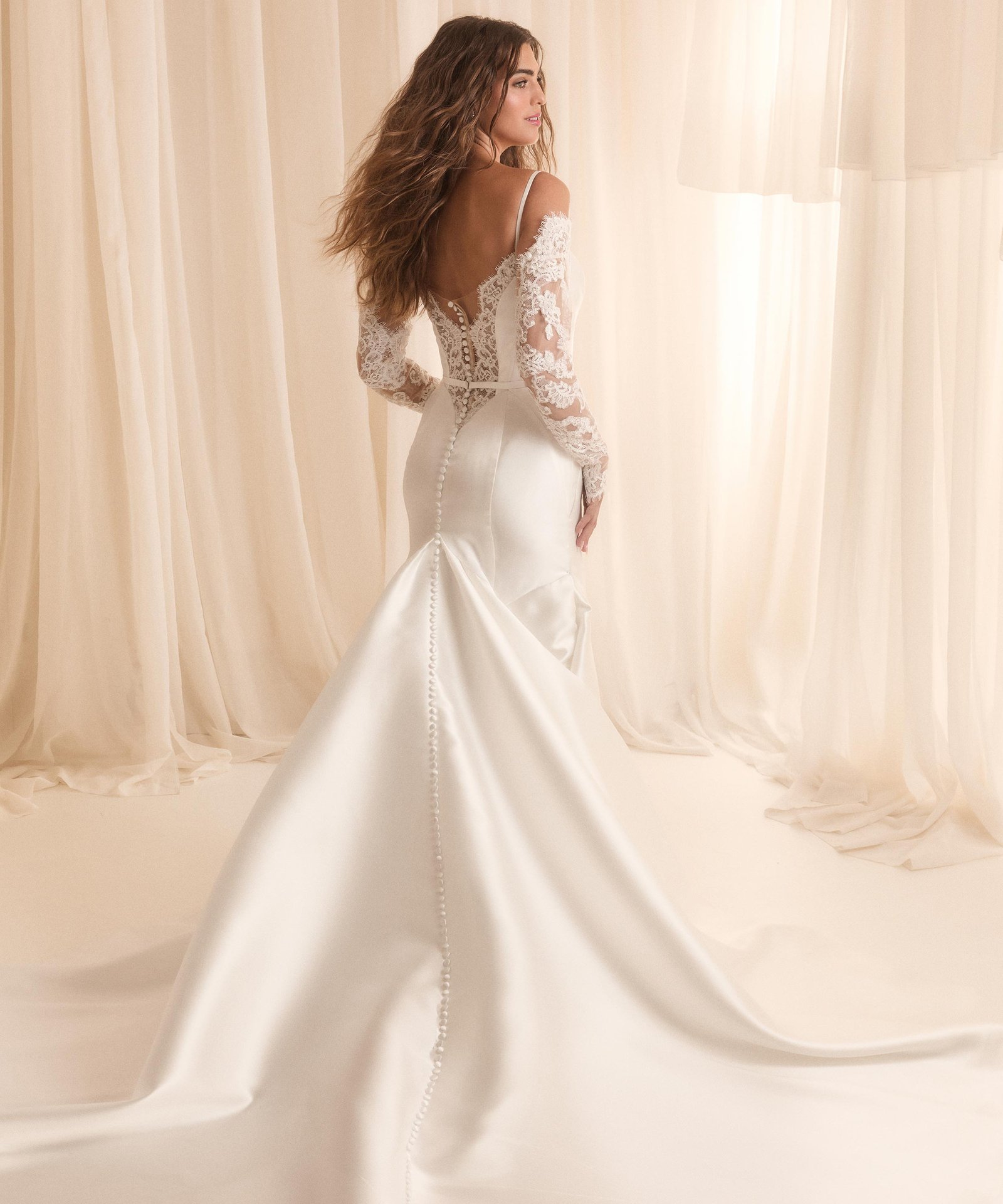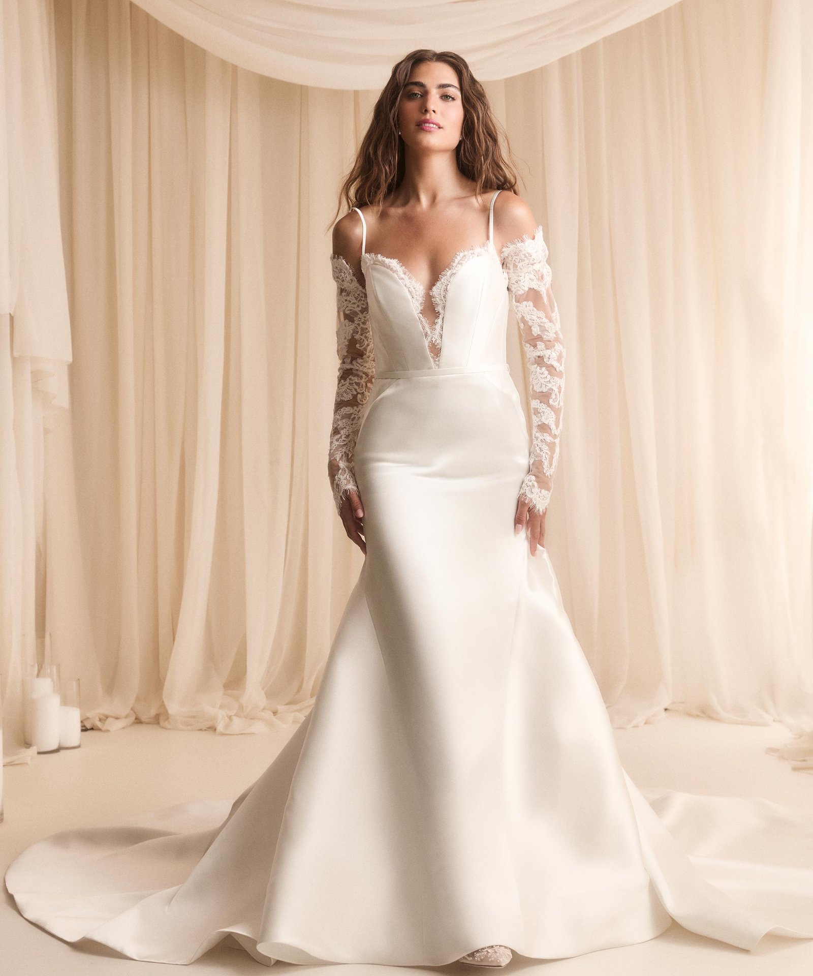 Deep v plunge neckline with scalloped lace trim. Deep illusion back neckline with lace scalloping and covered buttons to end of train. Trumpet skirt. Separate corded lace sleeves and detachable obi styled bow