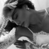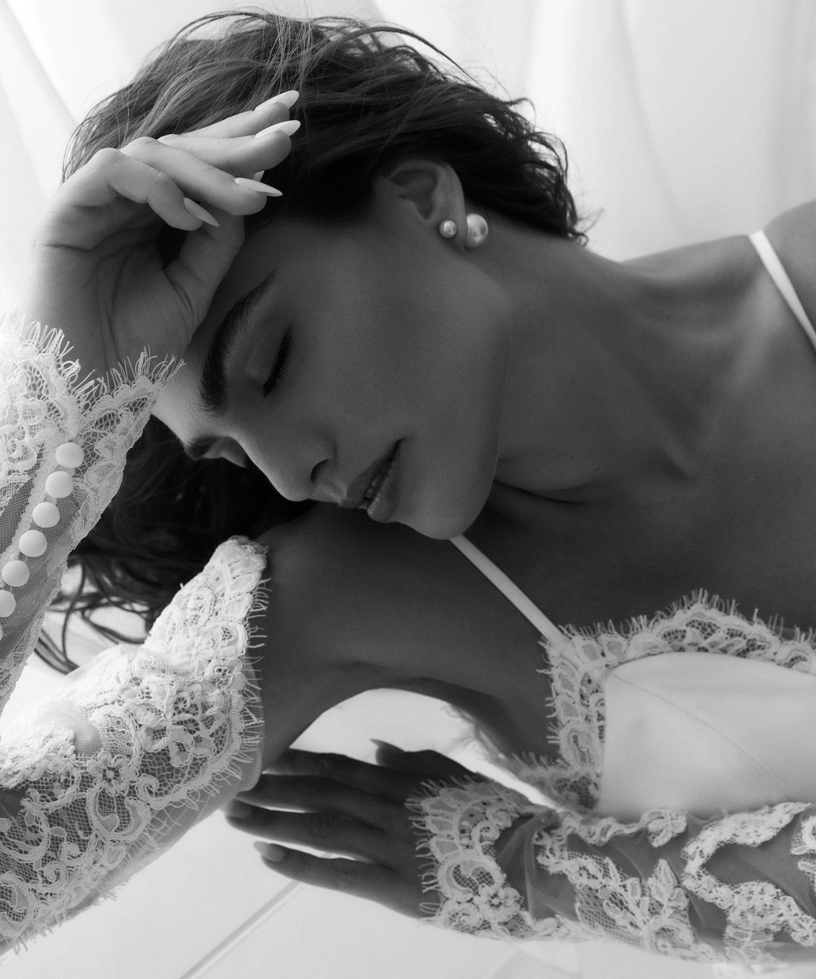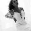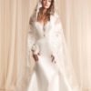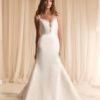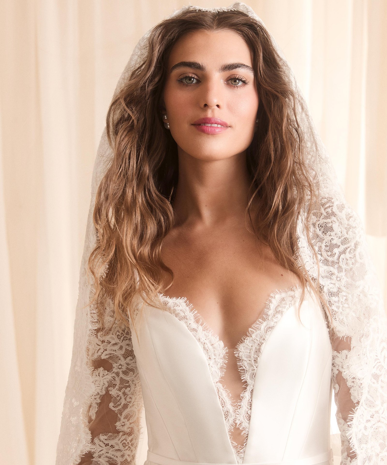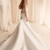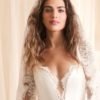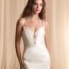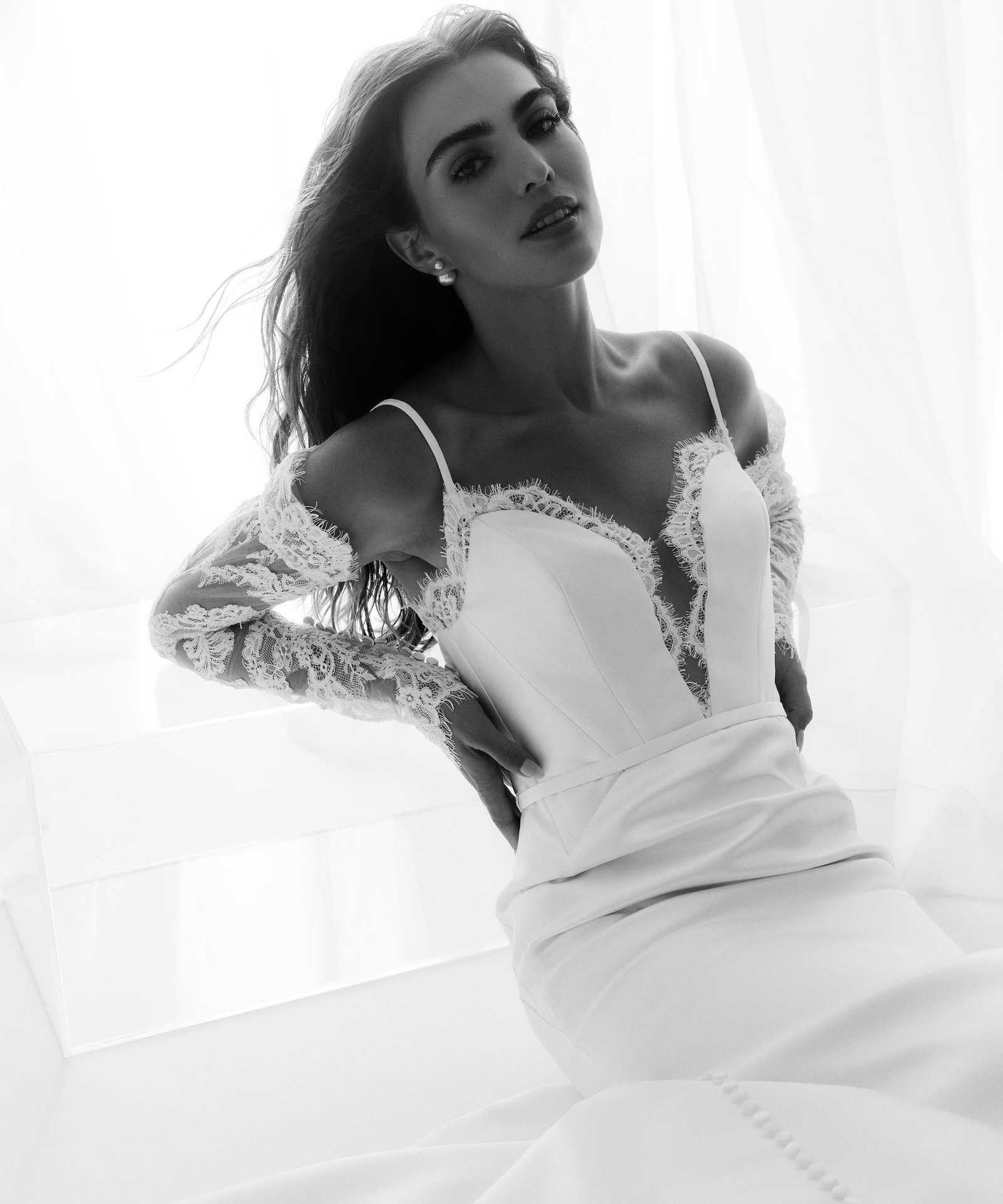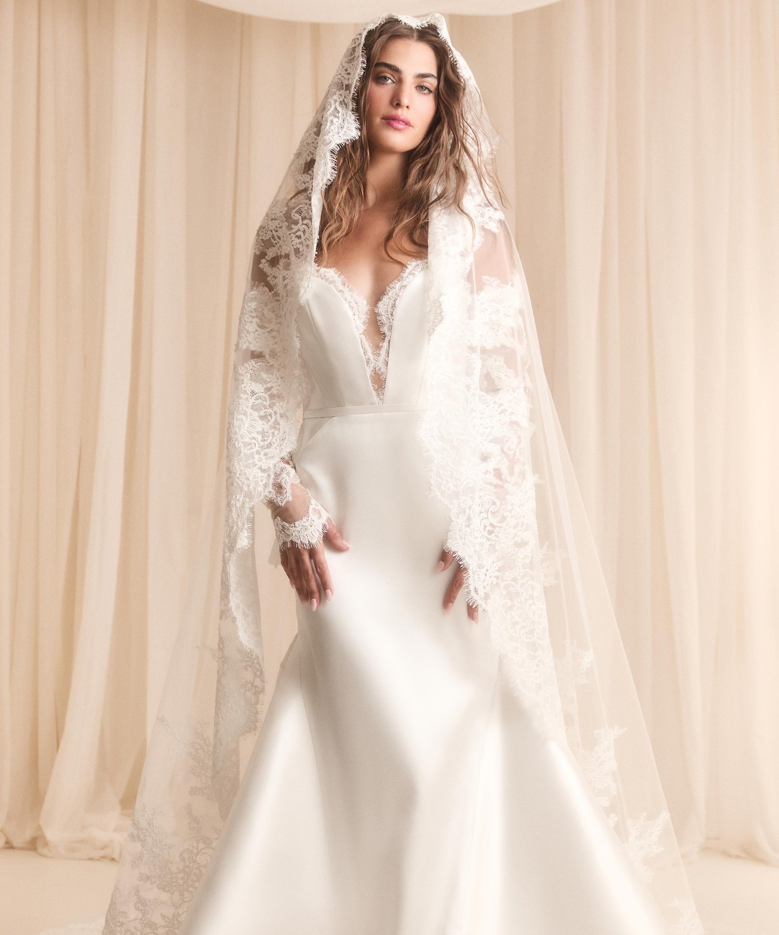 Deep v plunge neckline with scalloped lace trim. Deep illusion back neckline with lace scalloping and covered buttons to end of train. Trumpet skirt. Separate corded lace sleeves and detachable obi styled bow
