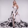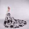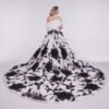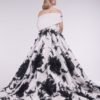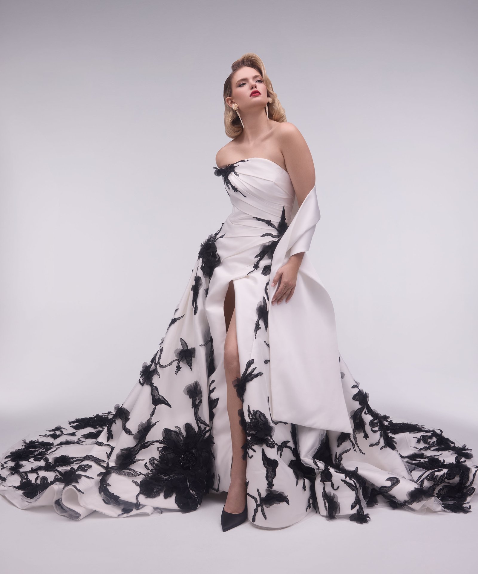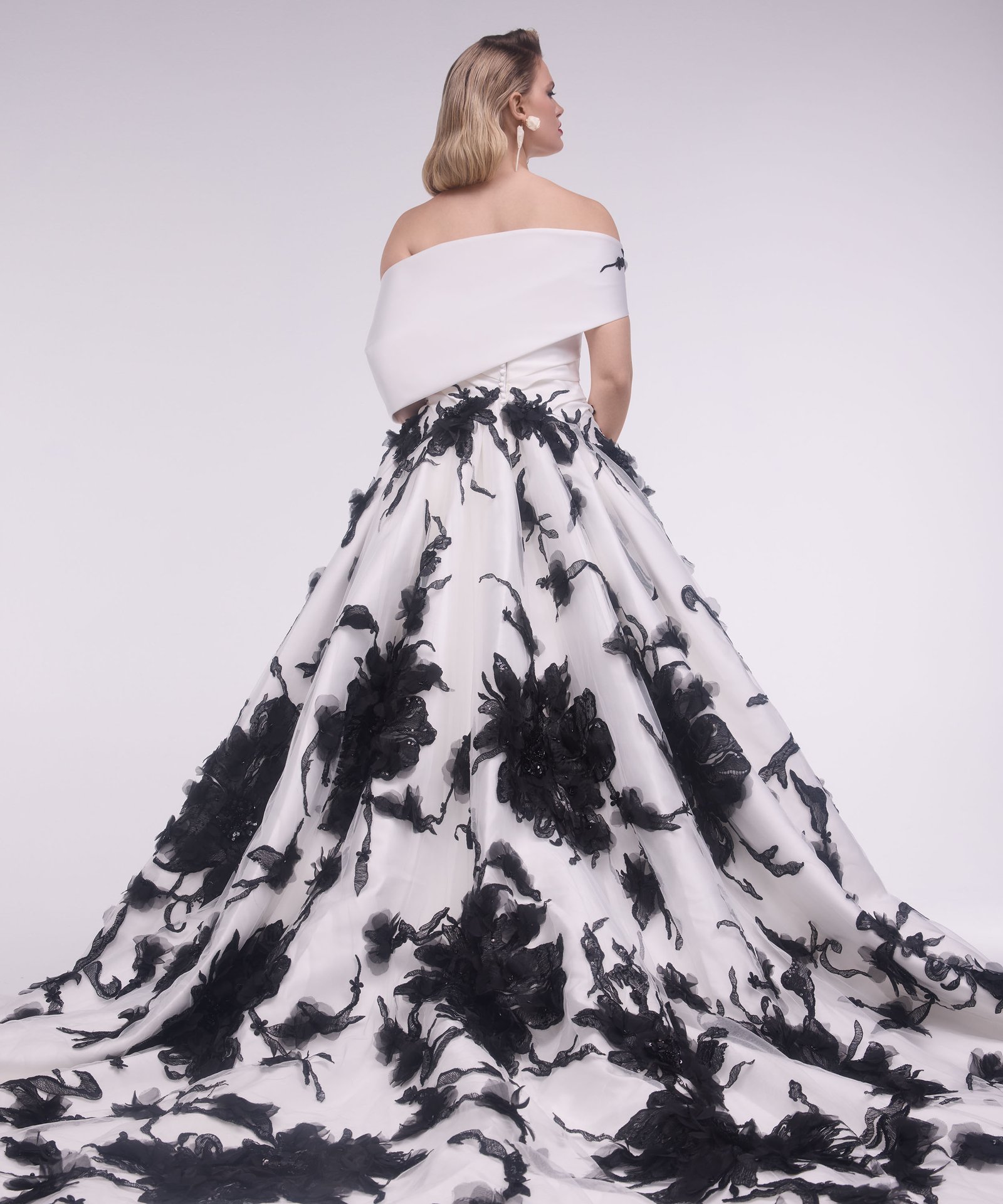 Silk new magnolia italian adjusted silhouette ball gown. Draped straight across neckline with side slit. 3d hand made black lace placed on top creating phenominal look. Detachable long falling off the shoulder swag shawls.