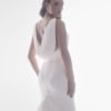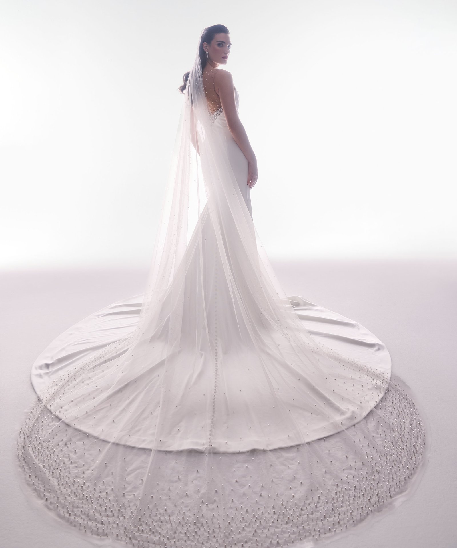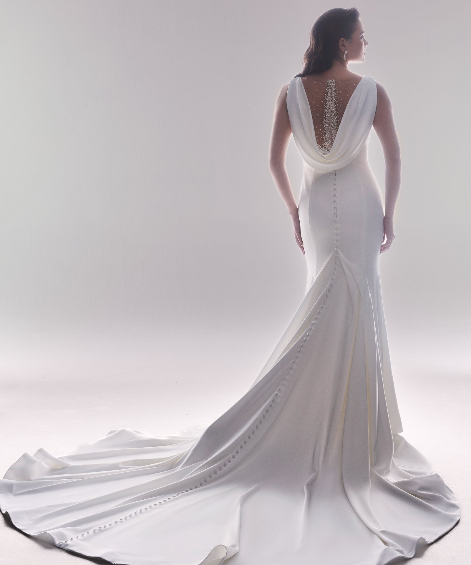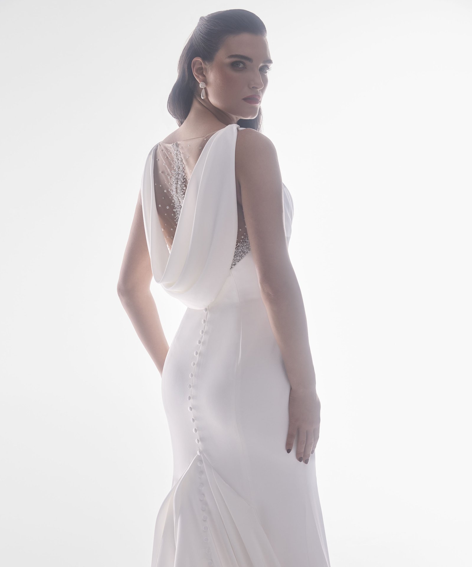 Italian silk crepe fit and flare gown with bateau neckline and draped bodice. Hand beaded pearl back detail on top of shear italian invtulle. Detachable draped open back shawl.