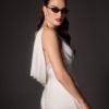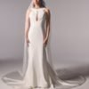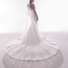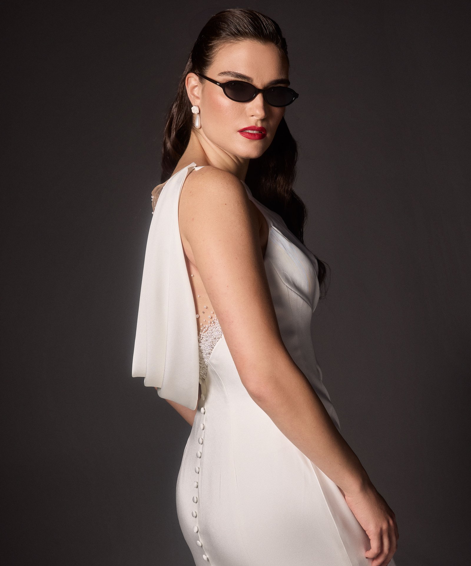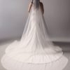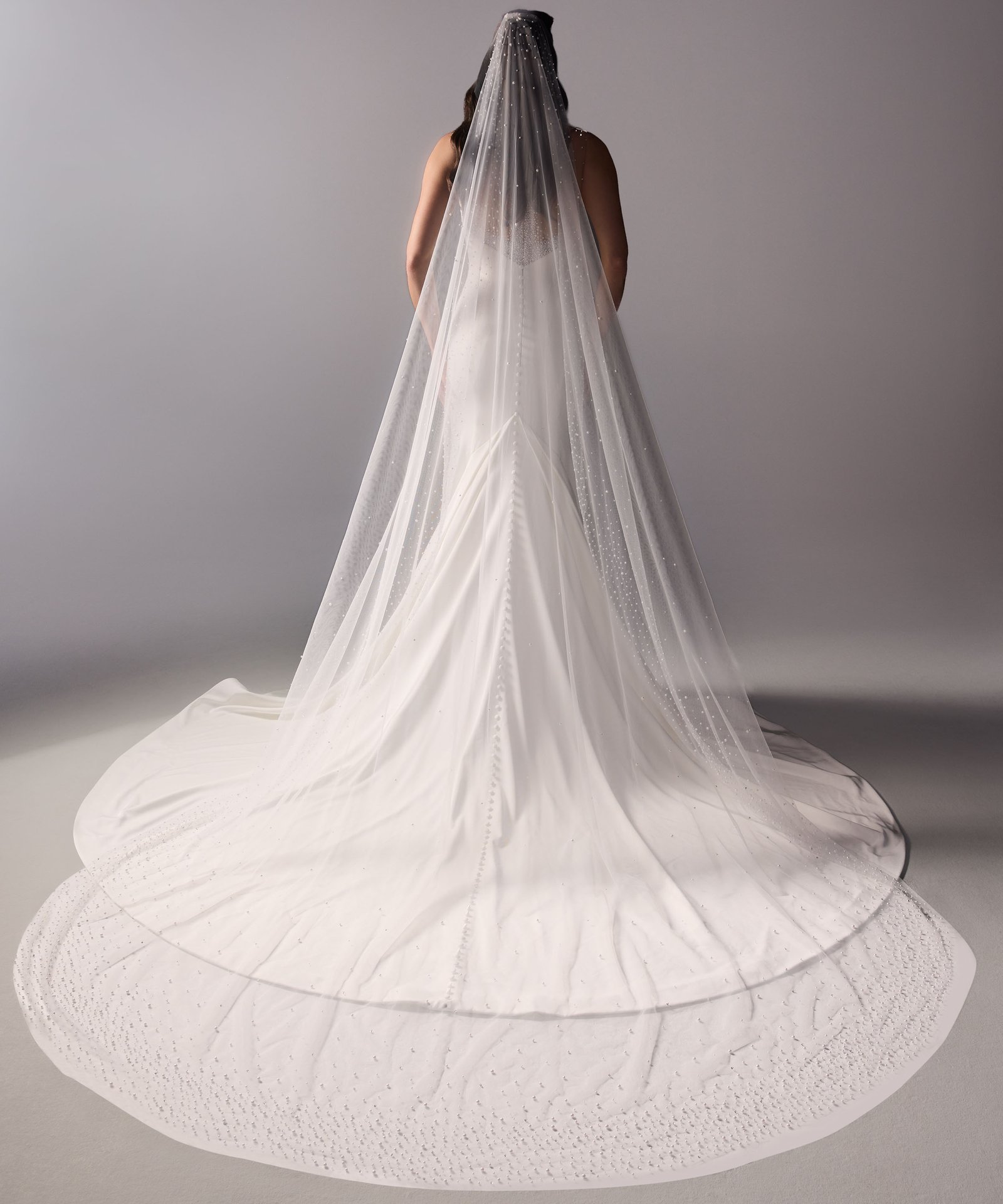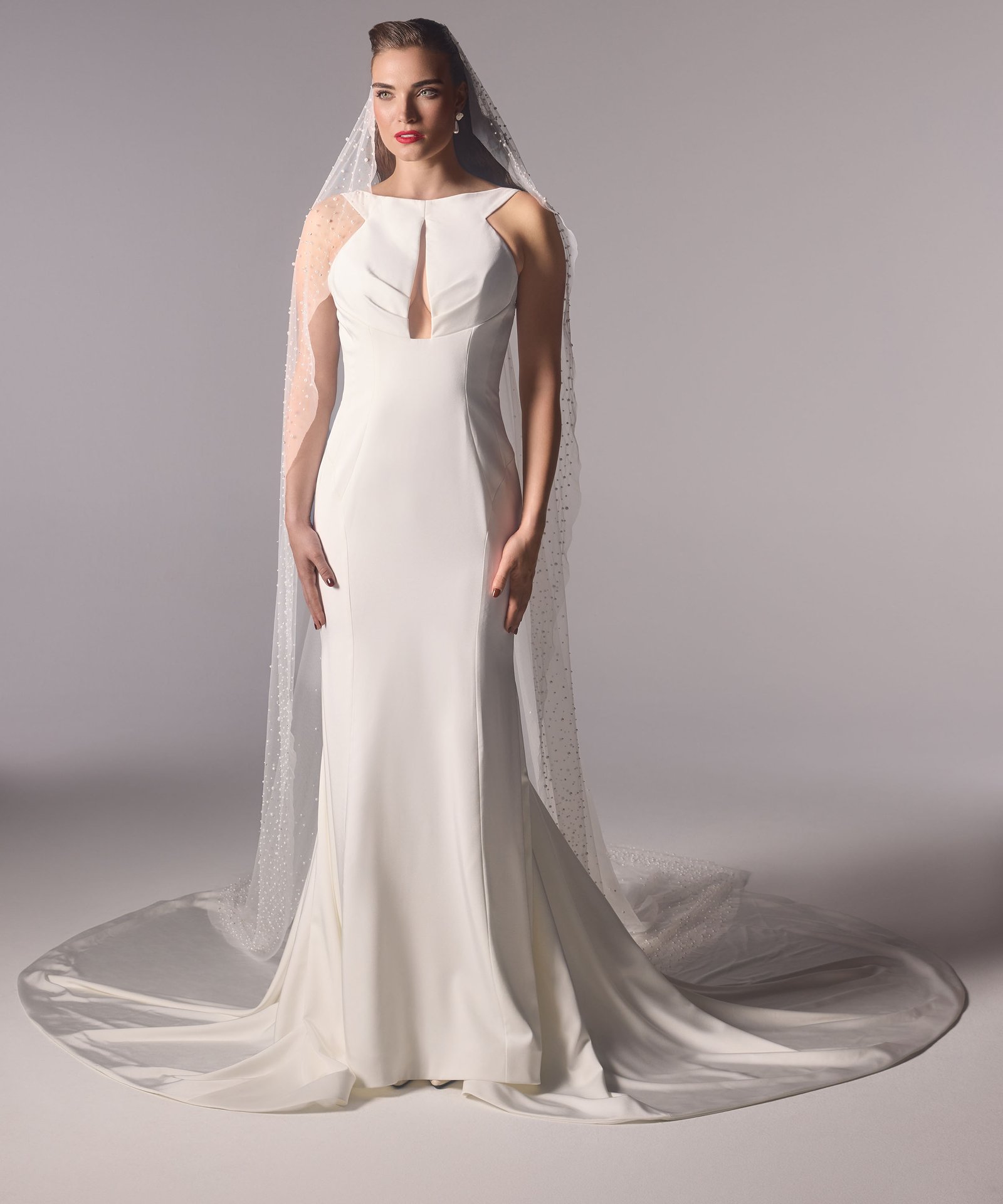 Italian silk crepe fit and flare gown with bateau neckline and draped bodice. Hand beaded pearl back detail on top of shear italian invtulle. Detachable draped open back shawl.
